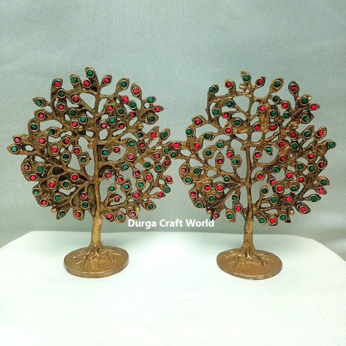 Stone-Adorned Brass Tree Sculpture - Pair